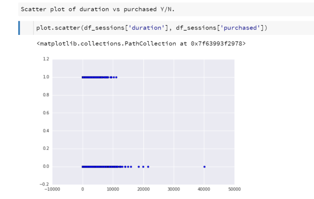 Cool! So next I decided to do a scatter plot of session durations vs whether the user made a purchase or not. I was curious to see if there was some visual trend I could spot.