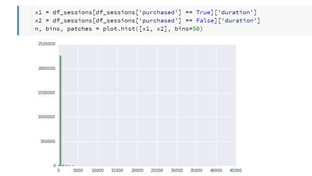 I am not going to explain Pandas in great depth here, but in the above example “df_sessions” is a “data frame” (table-like) data structure. Python allows you to define operators for your own data types, so in the above code the square brackets accepts a vector of Boolean values then returns rows from the table where the corresponding Boolean value in the vector is true. That is, “df_sessions.purchased == True” returns a vector of true/false values (all rows in df_sessions where the purchased column is true). This vector is then used to choose which rows to return out of the df_sessions table.