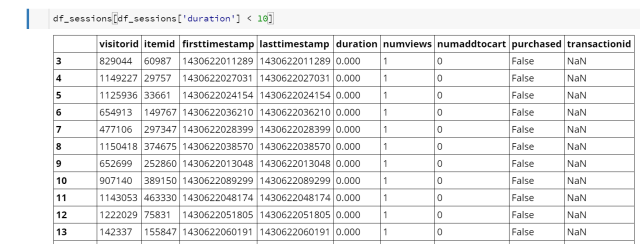 Oh, well that makes sense. There are lots of occurrences where a user viewed a single product and bounced from the site. They never went on a did a second operation, so the duration for the “session” was computed as zero. Let’s filter out those data points and keep going.