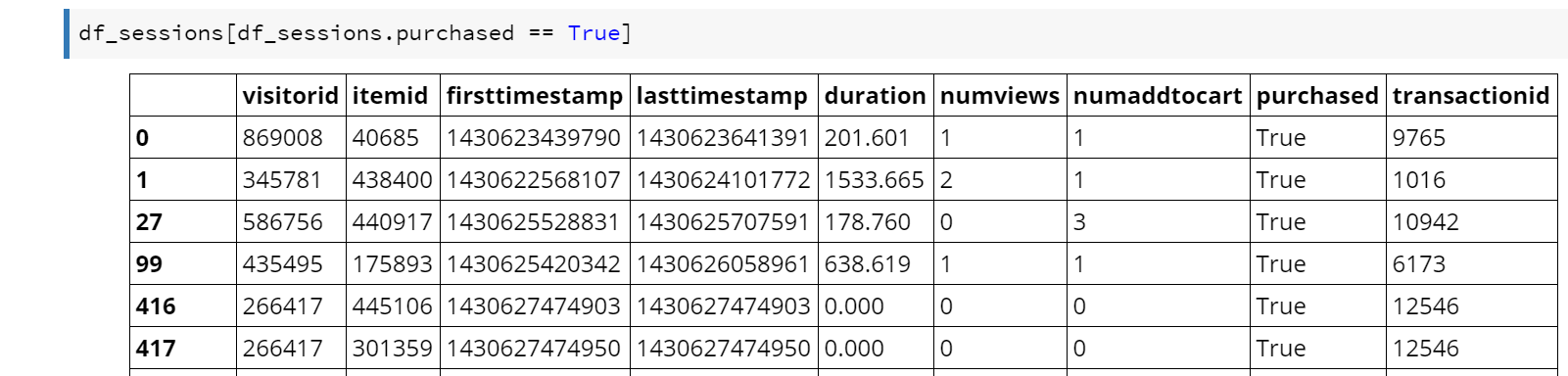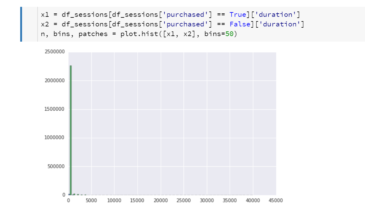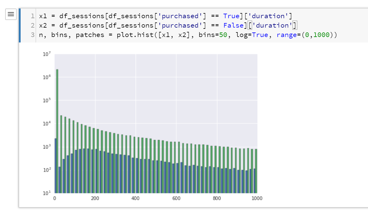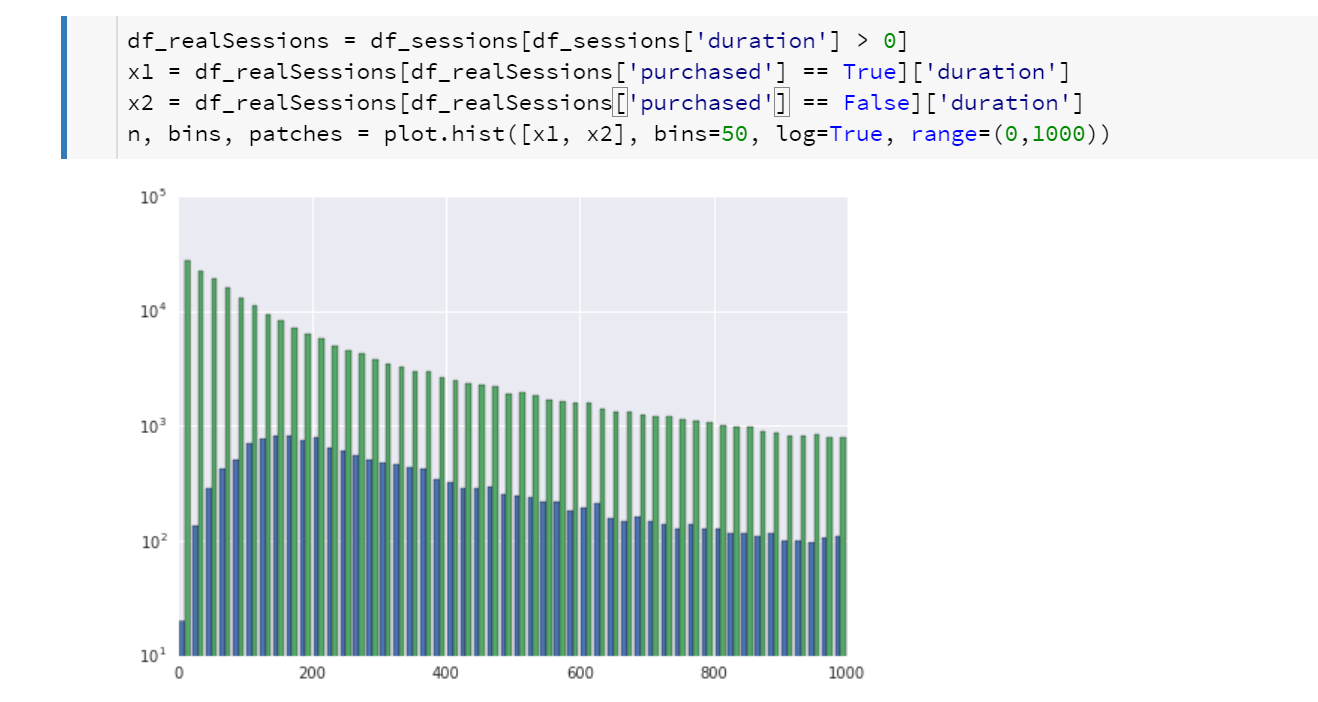 I am not going to explain Pandas in great depth here, but in the above example “df_sessions” is a “data frame” (table-like) data structure. Python allows you to define operators for your own data types, so in the above code the square brackets accepts a vector of Boolean values then returns rows from the table where the corresponding Boolean value in the vector is true. That is, “df_sessions.purchased == True” returns a vector of true/false values (all rows in df_sessions where the purchased column is true). This vector is then used to choose which rows to return out of the df_sessions table.