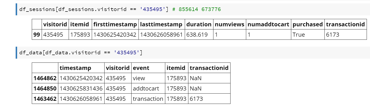 One thing I found very useful with Jupyter was the ability to incrementally write code and embed little fragments to check my results as I went along. For example, the following shows checking the consolidated data (df_sessions) against the original data (df_data).