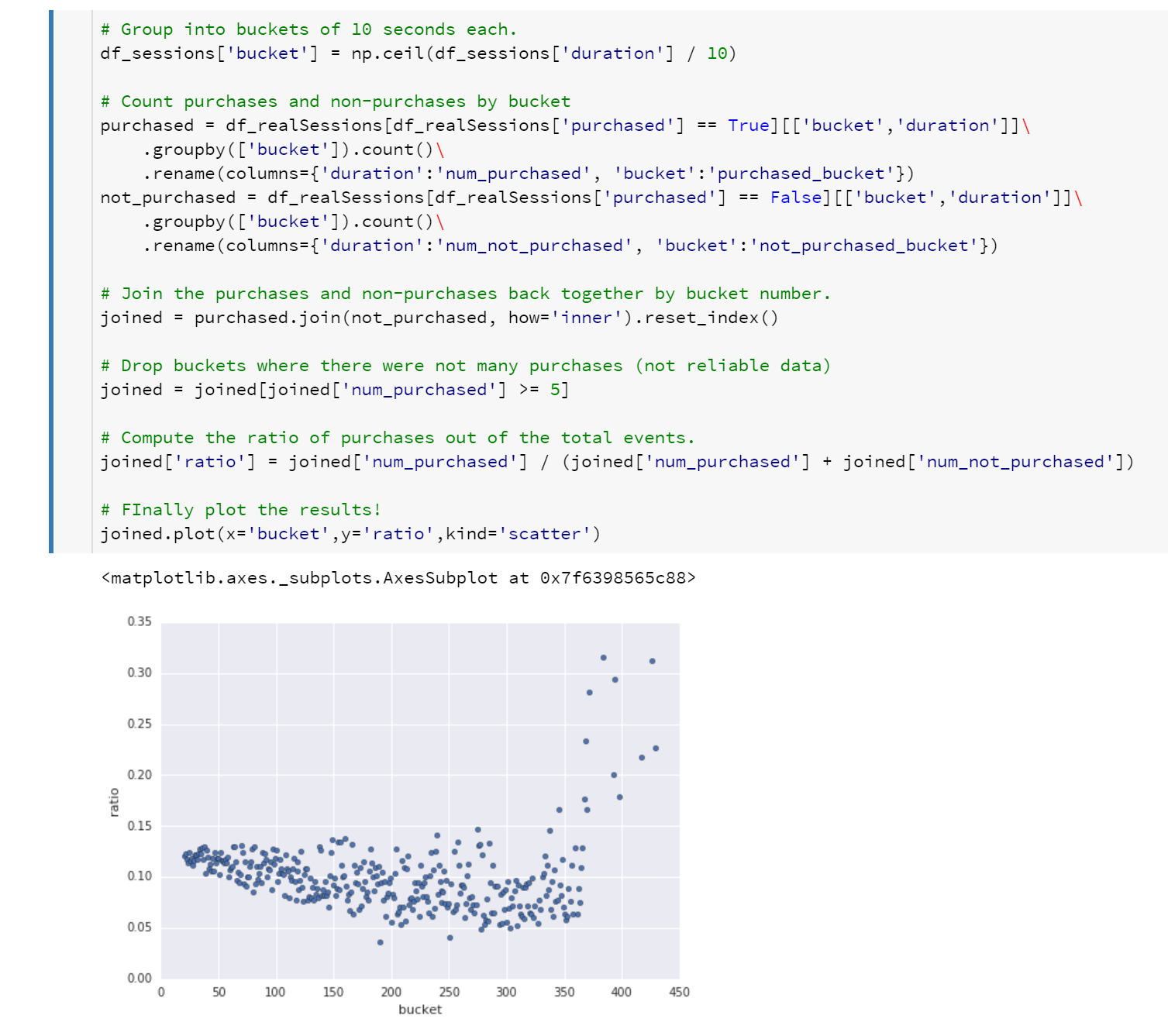 That is starting to get more interesting data. Remember that the bucket number is duration divided by 10, so “50” means 500 seconds. If you guess a line to draw through the data, you can see the number of purchases as a percentage of total sessions is decreasing as the length of the session increases.