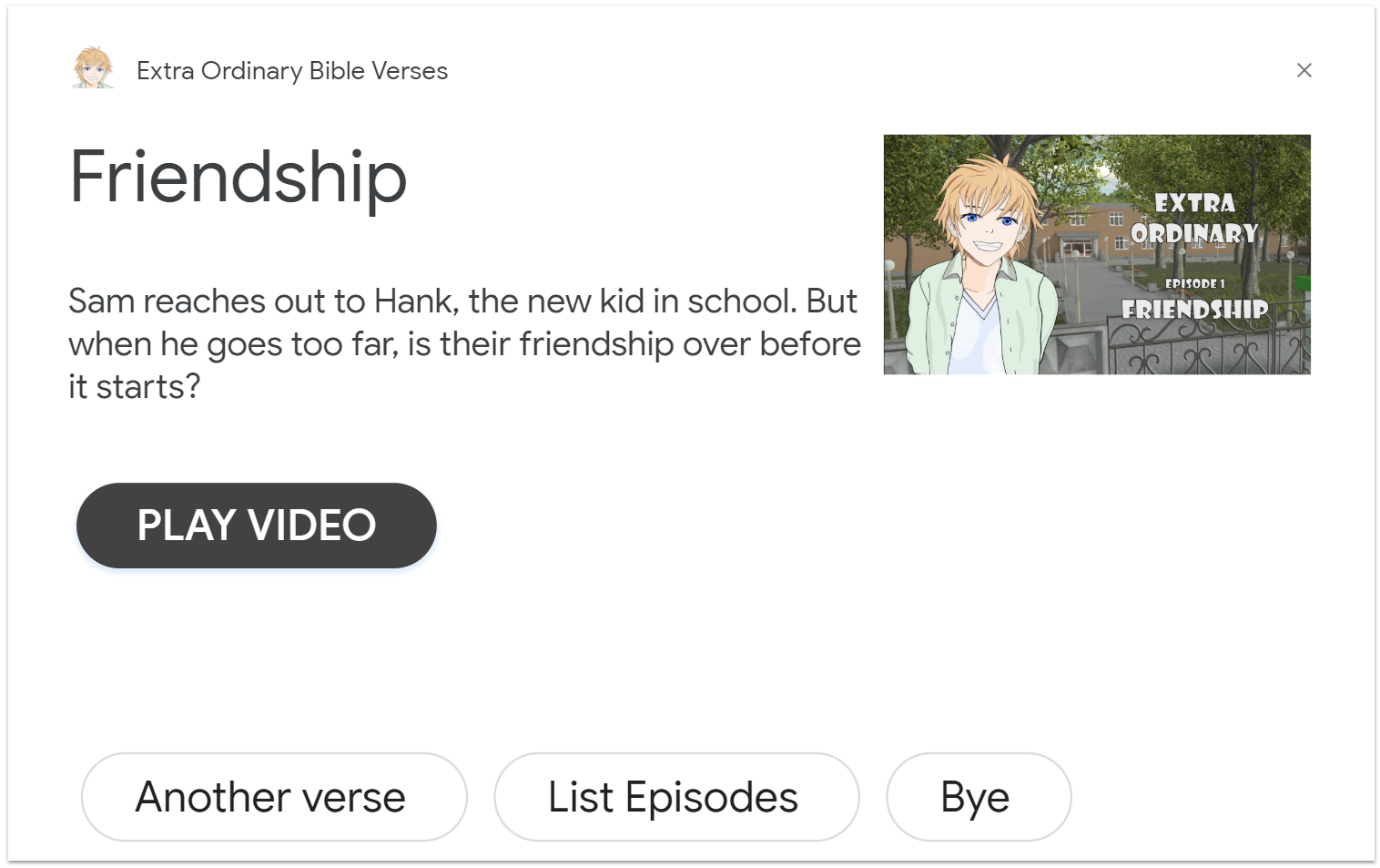 I created this application to demonstrate branded experiences based on supporting a series of videos on YouTube I am slowly producing (cartoons for kids backed by principles from bible verses – see https://extra-ordinary.tv/ for more details). To add a bit of richness, I decided to create an app that could both navigate users to episodes and play random bible versus. To increase engagement it will also notify users when new content is available. The verses are presented by characters from the series as a form a brand reinforcement. Commerce applications may be notifications of new blog posts or new product offerings – e.g. the cake of the week from your local cake store.