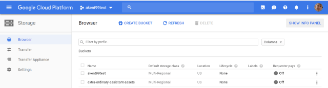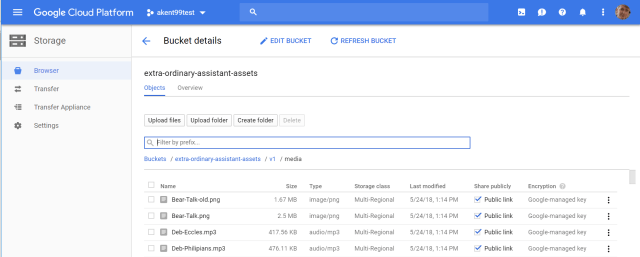 I created a bucket called “extra-ordinary-assistant-assets” to hold my media. I then created a directory tree of “v1/media” and uploaded all the media files to this folder. I set the “Share publicly” link on for all the files. There are APIs to access this storage, but I just enabled them all by hand. (I had set myself the personal challenge of building a complete working application only using consoles.)