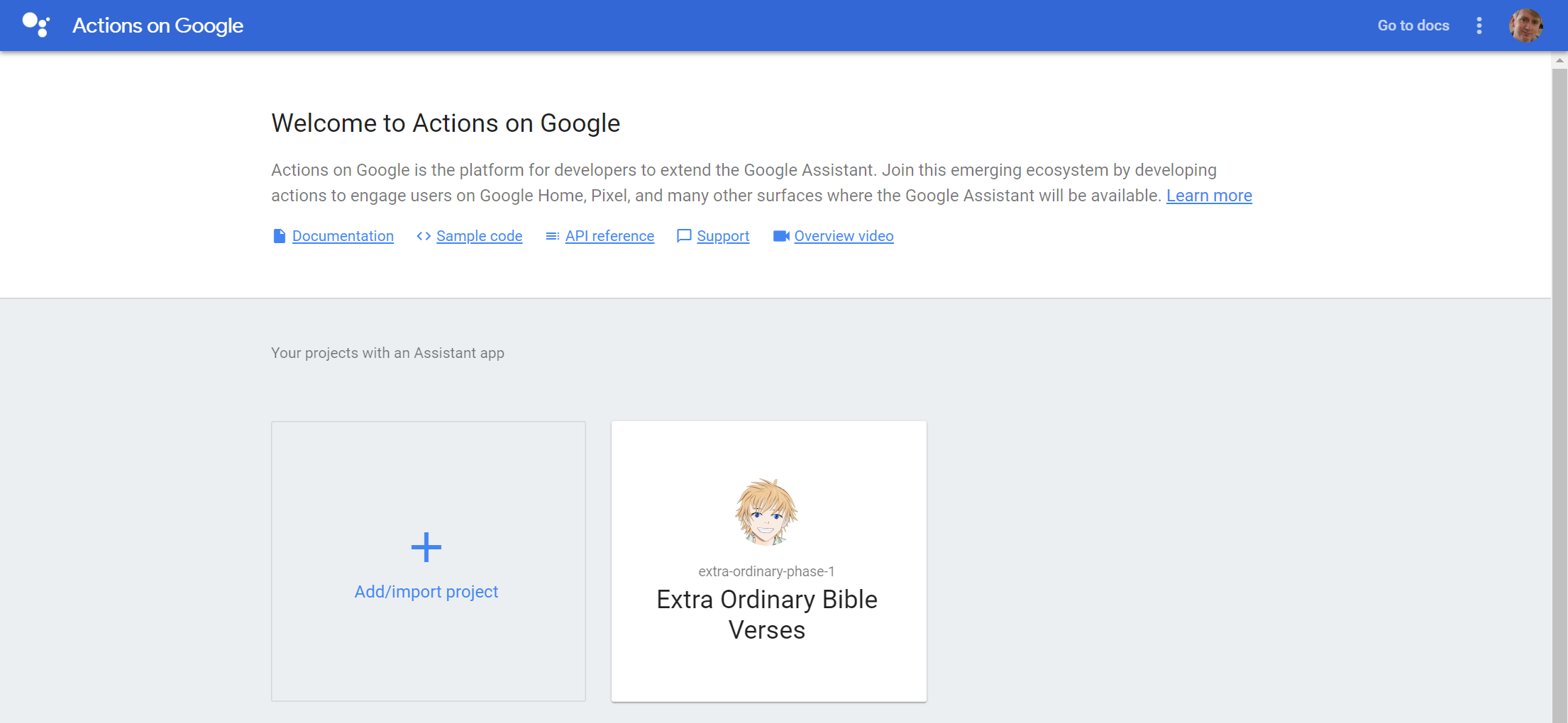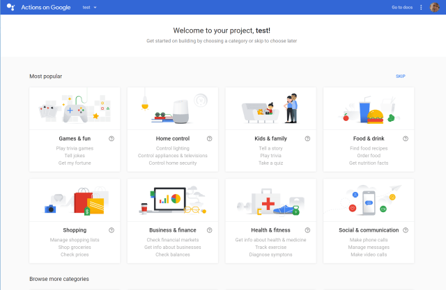 Navigating to the Actions on Google console you can create your new Google Assistant application project. The screenshot below shows my existing project.
