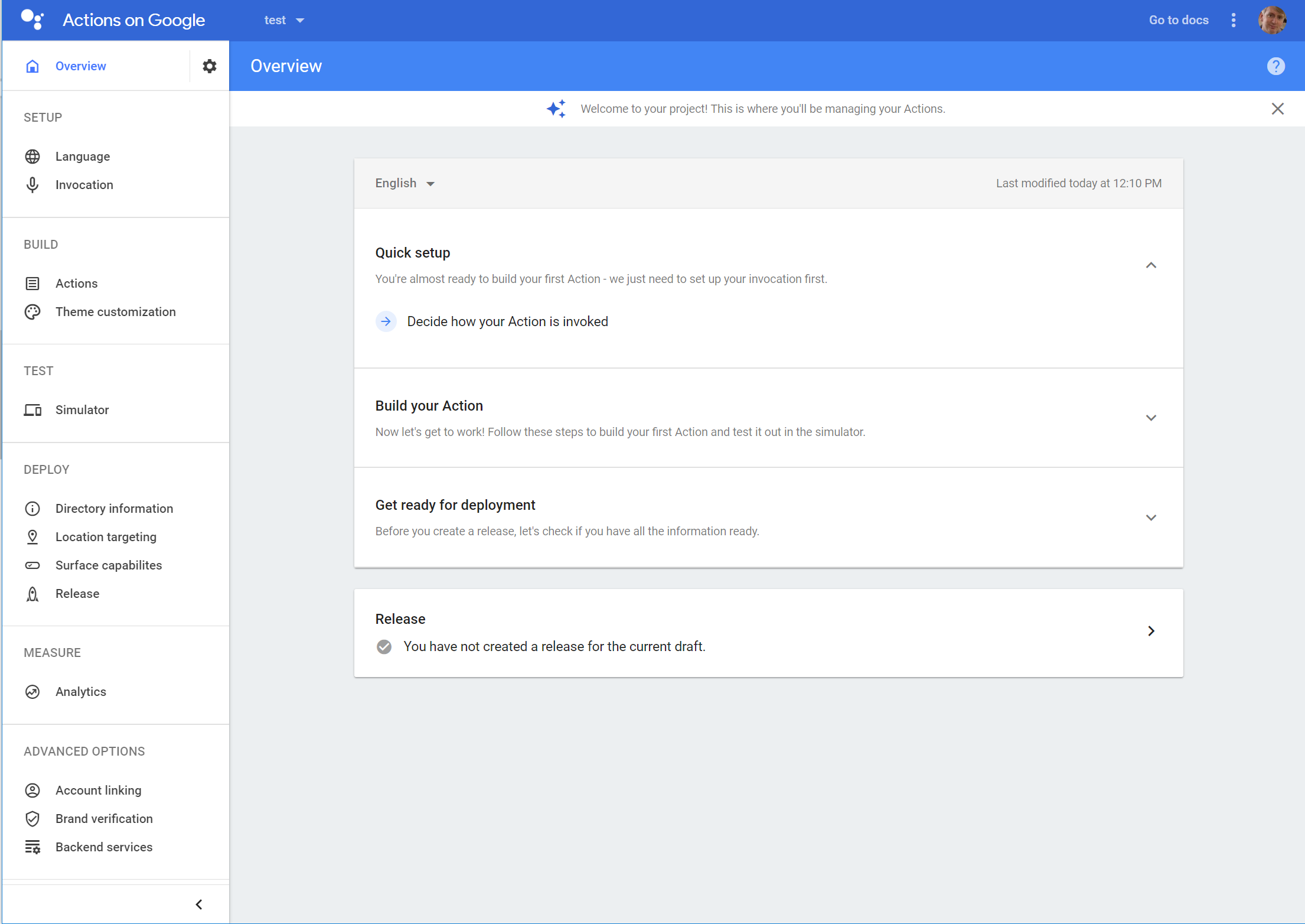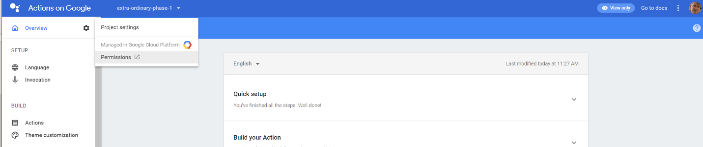 Clicking on “Decide how your Action is invoked” will prompt you for information like your application title (I used “Extra ordinary bible verses”) and some other related information. Click “Save” to save your information, then “Overview” in the side menu to go back to the top level menu. It should now show the quick setup is done, and offer you “Build your Action” choices.