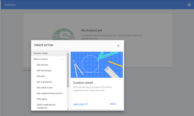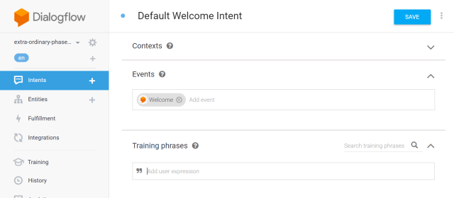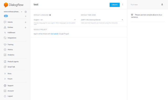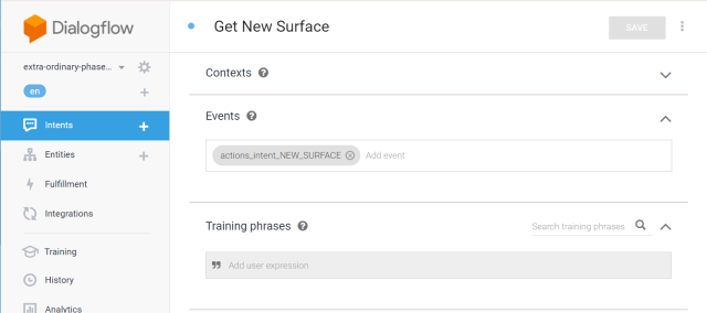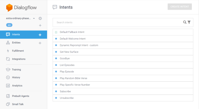 Clicking “Build” will take you through a few account selections and permissions flows and drop you into the Dialogflow console. This is where I spent most of my time building this app.