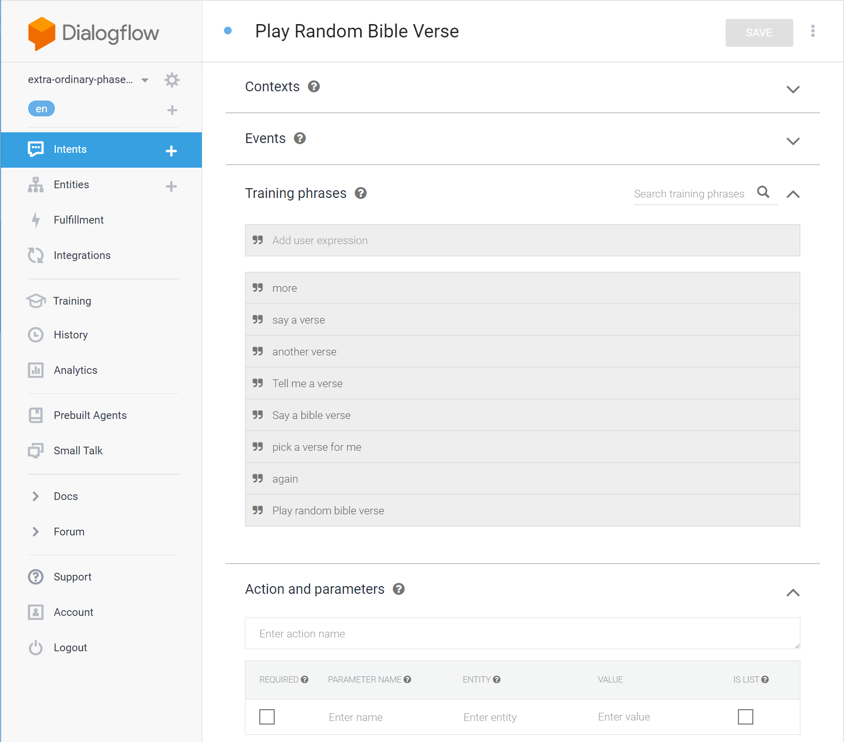Here is the “Play Random Bible Verse” intent definition.
