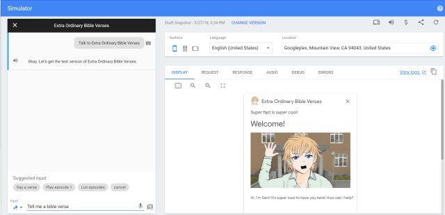 The “Play Random Bible Verse” intent does not use the “respond()” method because the spoken dialog consists of Sam introducing who says the real bible verse (“Here is a bible verse from Deb”), followed by the recording of the verse itself. Instead of “I’m on it” the text of the introduction is displayed – you may notice the verse text is not displayed – it is only shown on the card. The card also leaves off the introductory text on smart screens as it is not important – cards should display a summary of the most important information.