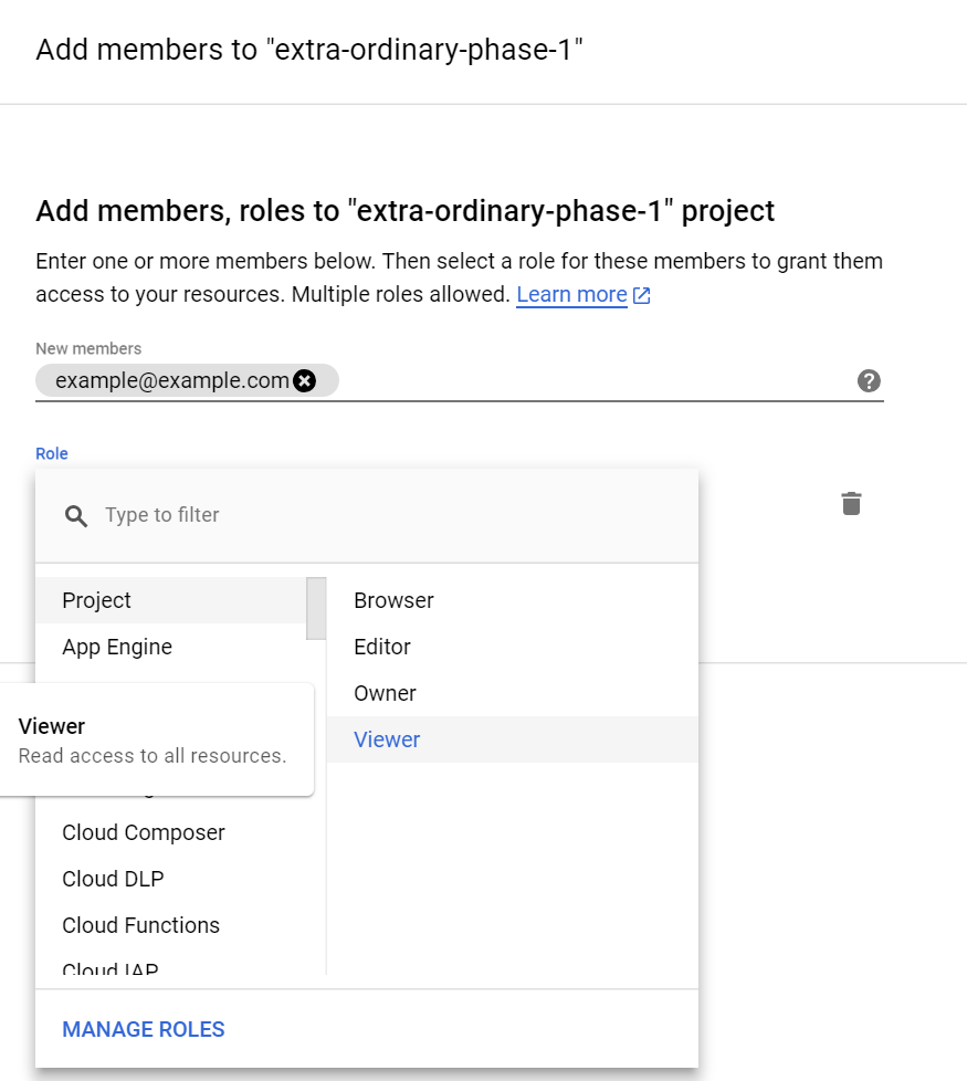 Clicking “Add” on the next page allows to you add email addresses of other users to grant access to your code. Grant these users the “Project” / “Viewer” role to try out your application.