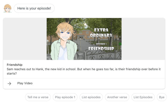 The supplied code is a complete working application for Google Assistant and delivers useful functionality. It shows how special purpose applications can be built relatively quickly. In order to create a branded experience, each time text is to be displayed a MP3 file is provided of the character’s voice. Whenever a screen is available, an image is also displayed of the character.