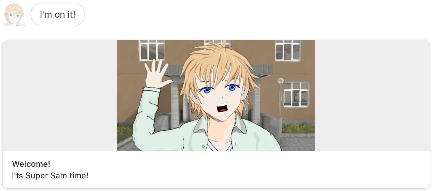 respond(conv, msg.text, msg.mp3Url, "Welcome!", samWelcomeImageUrl, "Welcoming Sam");