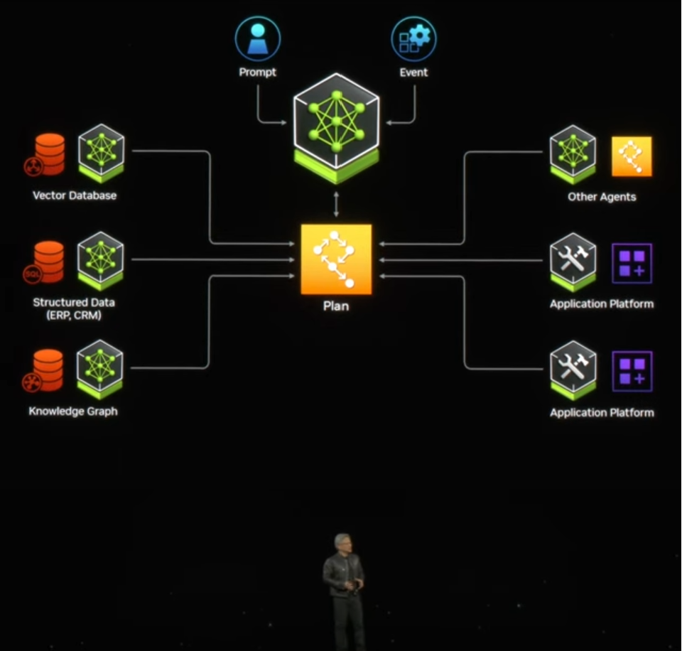 Scattered during the keynote, Jensen mentions NIM (and NeMo for training models). Some of the mentions describe how NVIDIA have a number of NIMs deployed internally. He describes how the services often include a language model fine-tuned for that domain, allowing you to chat with the services and ask them questions (not only have an API for other programs to use). This starts to feel more like an AI agent approach. Instead of just having “dumb” services that do exactly what the API says it will do, have a series of agents that solve one problem and “talk” to each other.